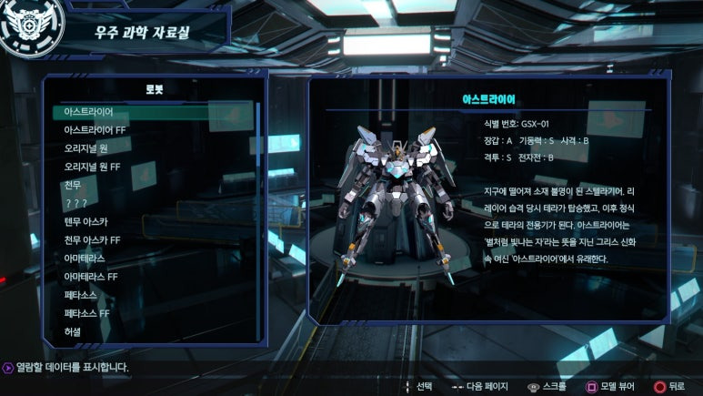 라이브러리 다 채우는 트로피가 신기한 게 격납고 로봇 전부 강화는 해당이 안 돼서 돈 아끼고 편하게 할 수 있음